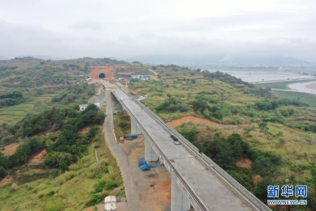 新建福厦铁路海尾隧道进口与湄洲湾跨海大桥相连接(4月29日摄,无人机照片)。