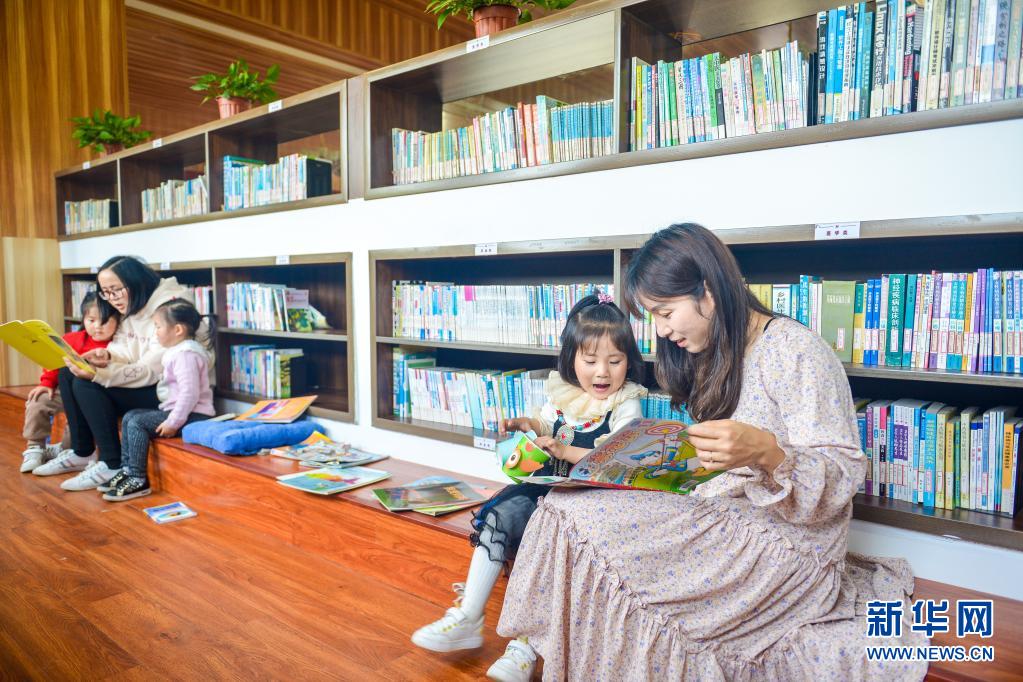 4月29日,浙江省湖州市长兴县龙山街道玄坛庙居民区儿童之家亲子阅读区内,一名家长带着孩子阅读。