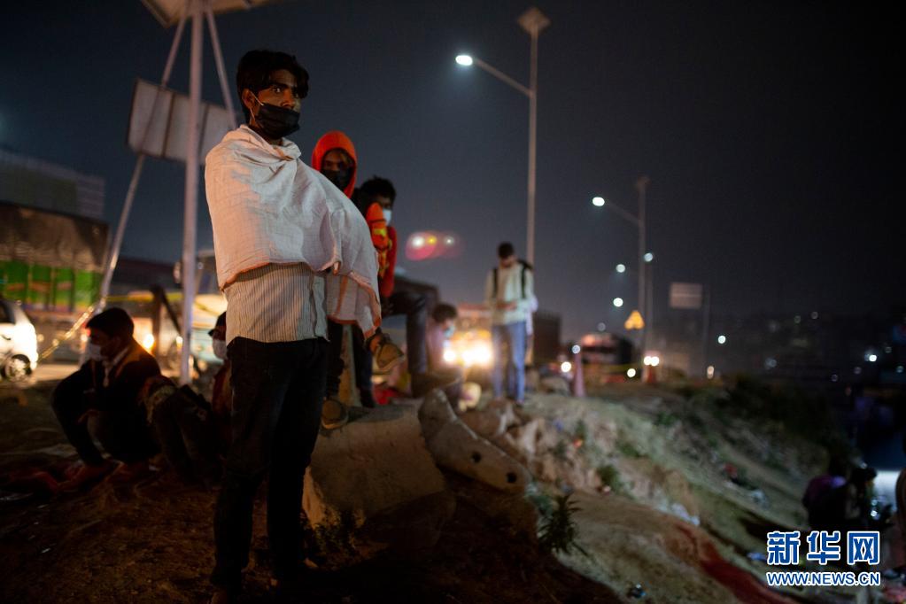 4月28日晚,人们在尼泊尔首都加德满都的路边等车,准备在封禁措施实施前离开加德满都返回家乡。