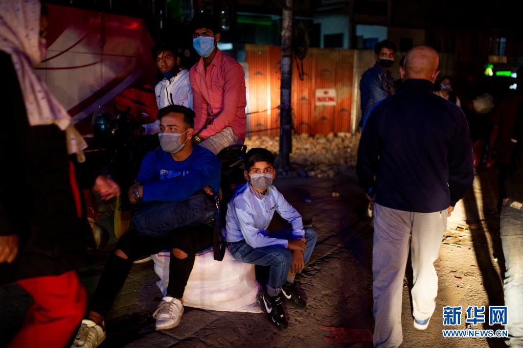 4月28日晚,人们在尼泊尔首都加德满都的路边等车,准备在封禁措施实施前离开加德满都返回家乡。