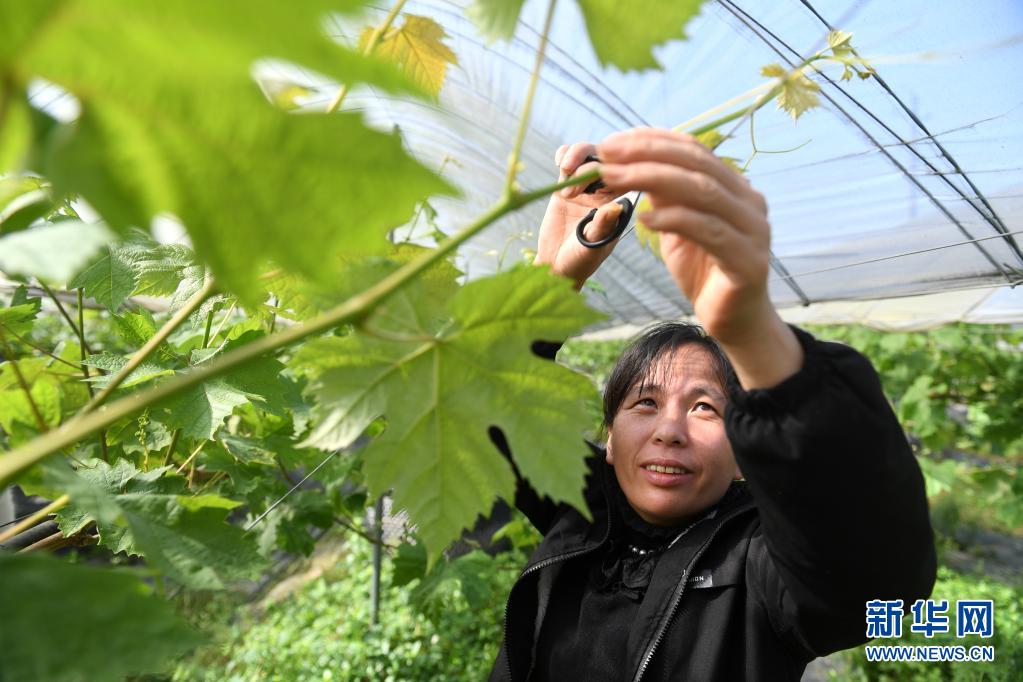 4月29日,在广西资源县“资水丹霞”田园综合体内的葡萄园,当地村民在修剪葡萄藤。