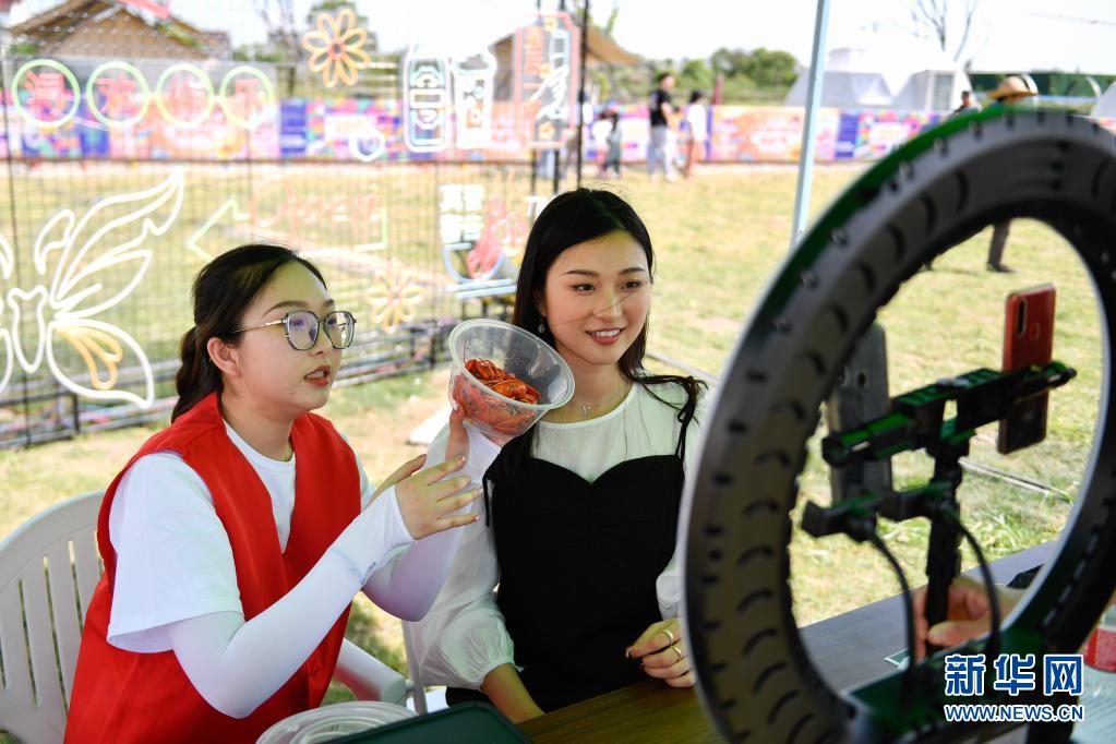 4月29日,南浔区石淙镇党员志愿者(左)通过直播带货的形式推介石淙清水小龙虾。
