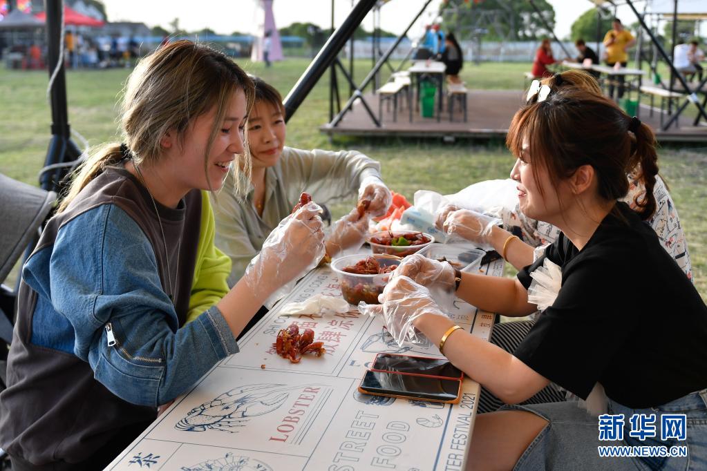 4月29日,游客在品尝石淙清水小龙虾。目前石淙镇共有5000多亩农田采用水稻与小龙虾生态共养模式。