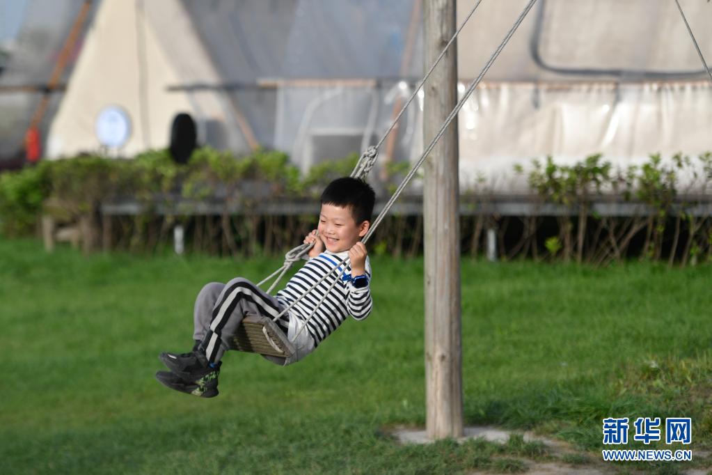 4月29日,一名小朋友在石淙花海边的一个帐篷营地里荡秋千。