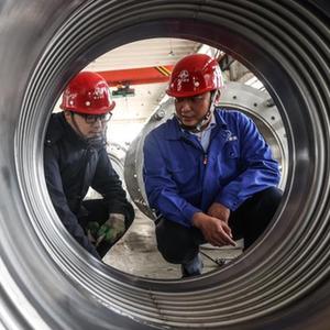 4月26日,王涛(右)在沈阳晨光弗泰波纹管有限公司生产车间与同事查看产品生产情况。新华社记者 潘昱龙 摄