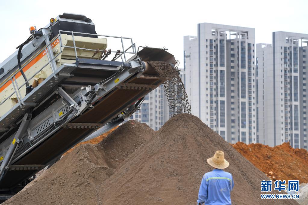 在广西柳州市移动式建筑垃圾资源化项目基地,建筑垃圾经过处置后转化为建筑领域再生骨料(2019年5月22日摄)。该基地可将90%以上的建筑垃圾转化为建筑领域再生骨料。