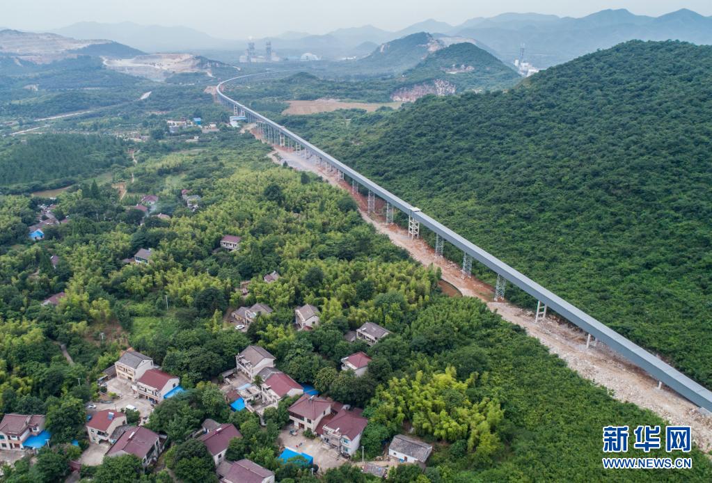 这是2018年6月5日拍摄的浙江省长兴县小浦镇“全电物流”项目的全封闭输送带(无人机照片)。该项目以纯电动输送带替代货运车辆,将原本通过重型车辆运输的矿山熟料产品通过输送带直接运输至物流码头,再由码头通过水路运往外地,全过程零排放。