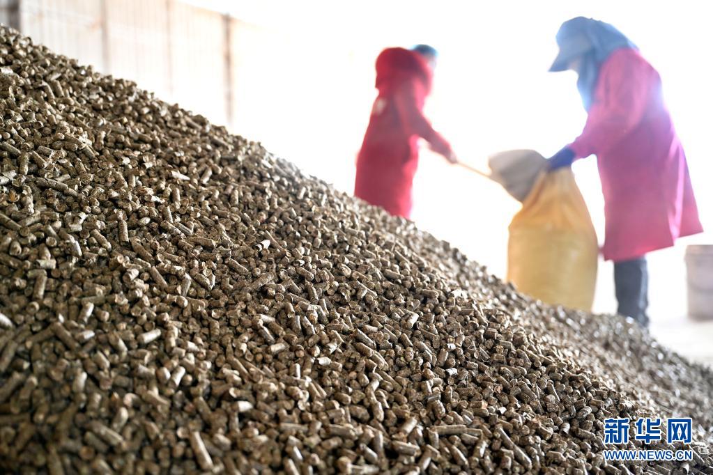 2021年1月19日,在广西柳城县一家新能源科技公司,回收的甘蔗叶经过处理后变成颗粒饲料。