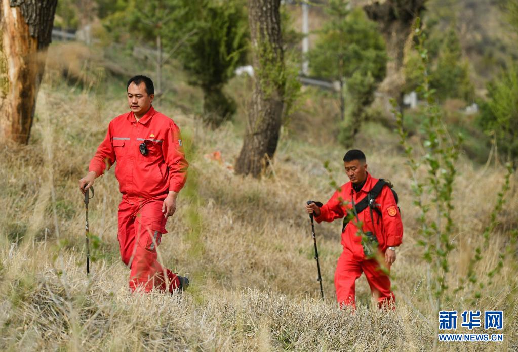 4月27日,巡线队员张伟伟(左)、张浩军在巡线途中。新华社记者 张博文 摄