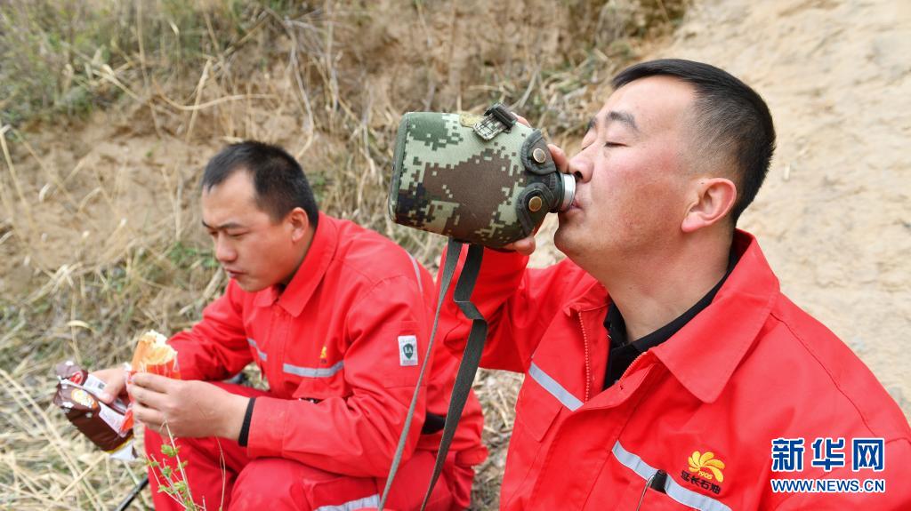 4月27日,巡线队员张伟伟(左)、张浩军在巡线途中吃饭。新华社记者 张博文 摄