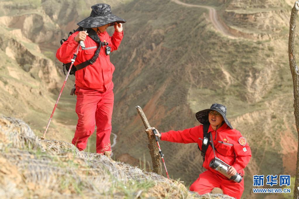 4月28日,巡线队员侯励峰(左)、曹硕在巡线途中休息。新华社记者 张博文 摄