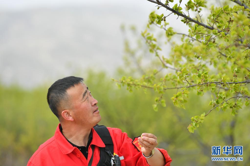 4月27日,巡线队员张浩军在巡线途中采摘野生水果补充体能。新华社记者 张博文 摄