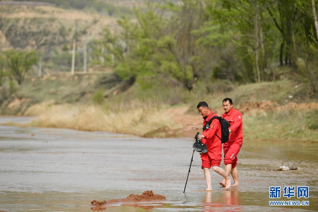 4月27日,巡线队员张伟伟(右)、张浩军在巡线途中渡河。新华社记者 张博文 摄