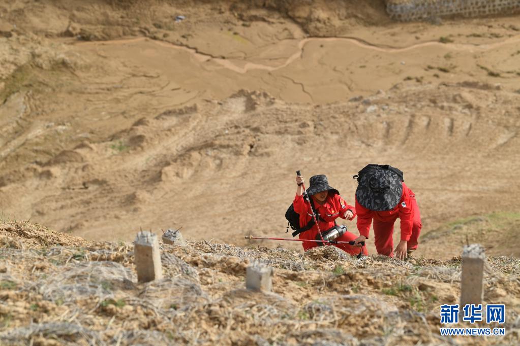 4月28日,巡线队员侯励峰、曹硕(左)在巡线途中。新华社记者 张博文 摄