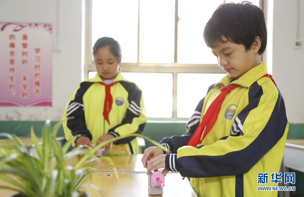 4月30日,邢台市北关街小学学生比赛削铅笔。