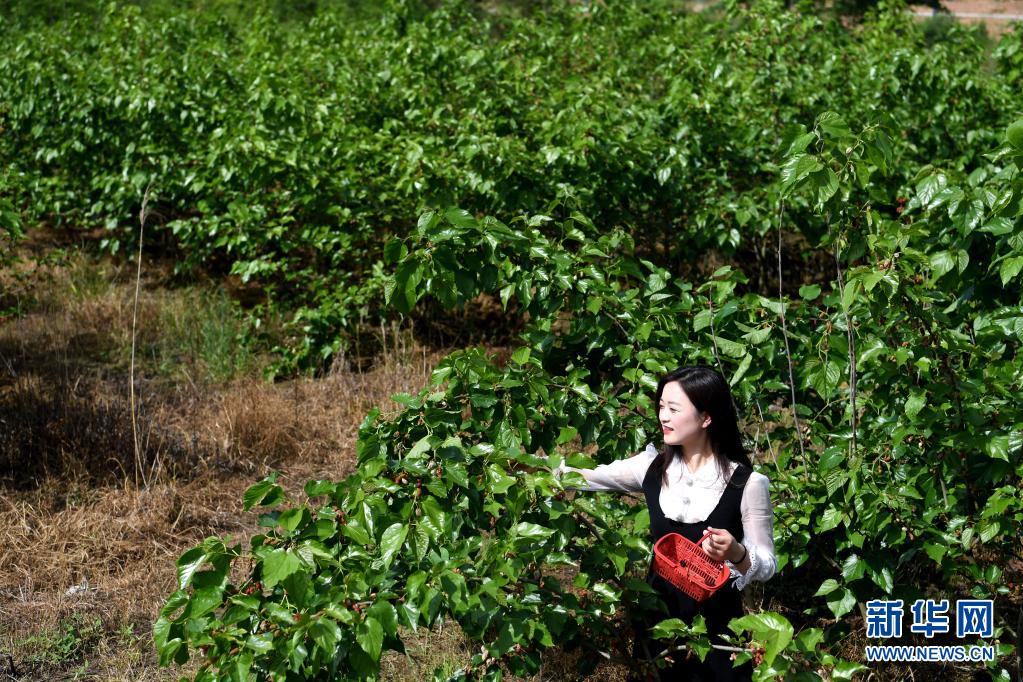 4月30日,游客在肥西县铭传乡聚星社区桑葚鲜果采摘基地里采摘桑葚。