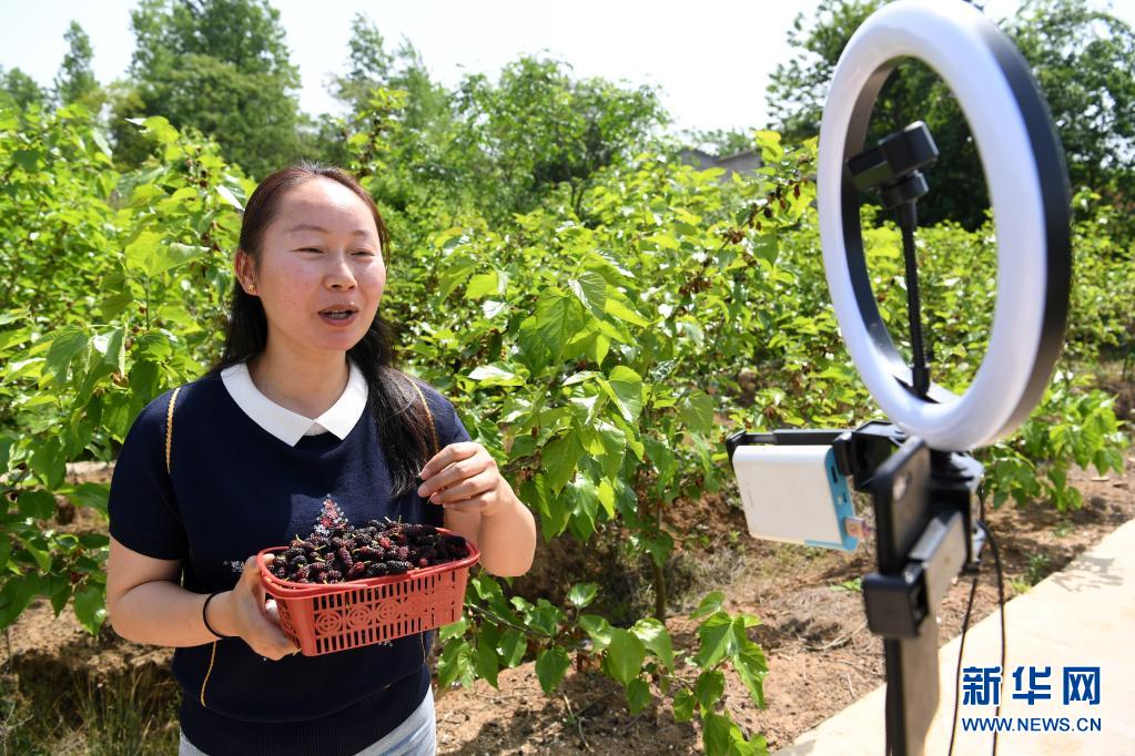 4月30日,肥西县铭传乡聚星社区村民通过直播平台介绍当地桑葚。