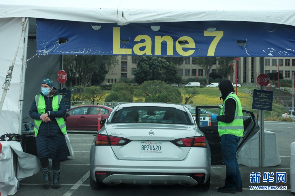 4月29日,在美国加利福尼亚州旧金山城市学院的新冠疫苗接种点,市民通过“得来速”的方式不下车接种疫苗。