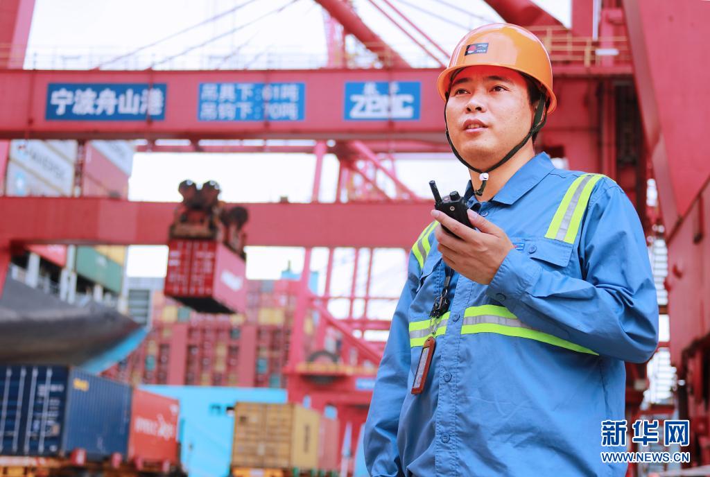 宁波舟山港北仑第三集装箱码头有限公司桥吊班大班长竺士杰在宁波舟山港码头工作(资料照片)。新华社发