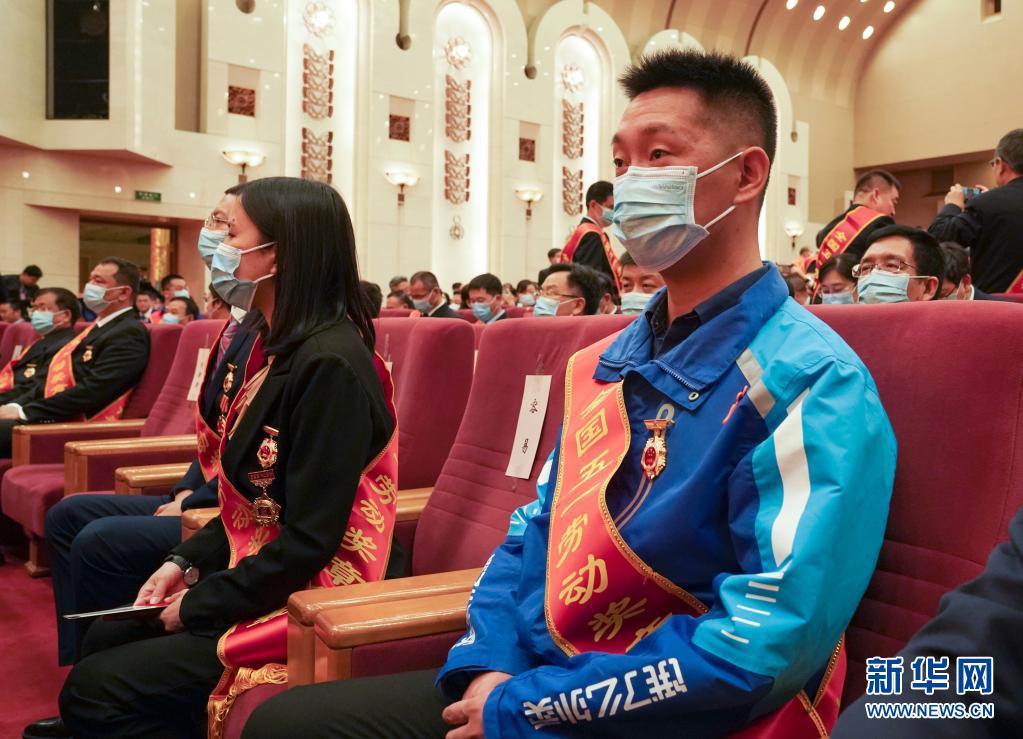 4月27日,外卖小哥宋增光(前右)参加在北京举行的2021年庆祝“五一”国际劳动节暨“建功‘十四五’、奋进新征程”主题劳动和技能竞赛动员大会。新华社发(王鑫摄)