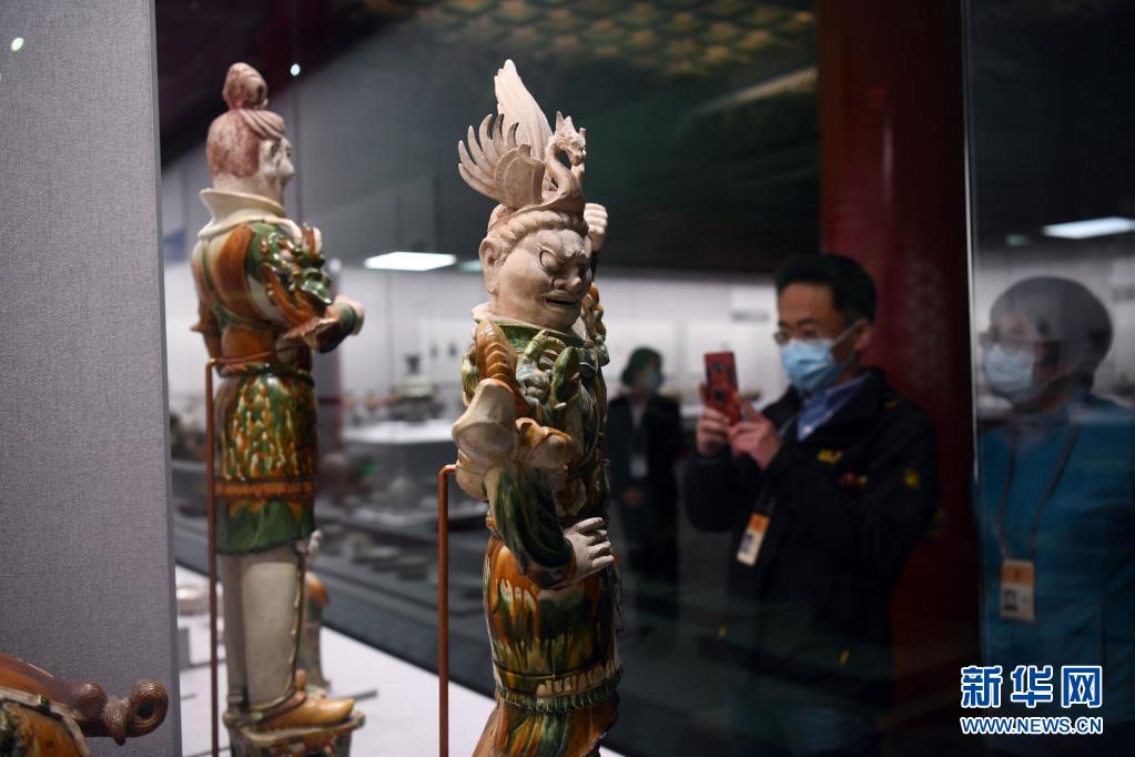 故宫博物院新陶瓷馆展出的唐三彩(4月30日摄)。