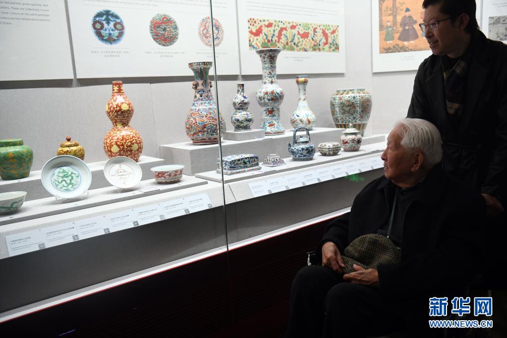 4月30日,古陶瓷研究专家耿宝昌在故宫博物院新陶瓷馆参观。
