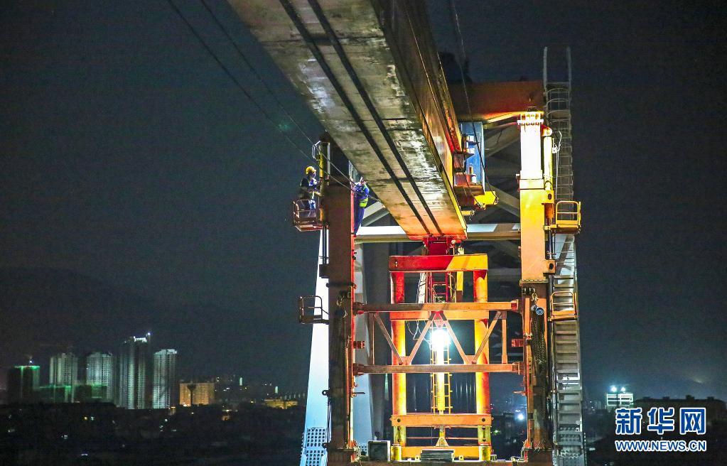 4月30日,中铁四局建筑工人在安九高铁庐山特大桥建设现场架设箱梁。