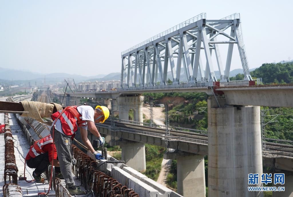 4月30日,中铁四局建筑工人在安九高铁庐山特大桥建设现场施工。