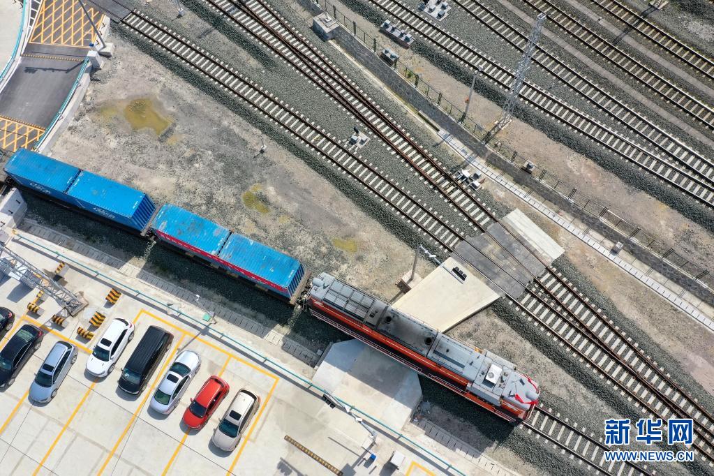 4月30日,首趟货运列车驶出贵阳都拉营国际陆海通物流港(无人机照片)。