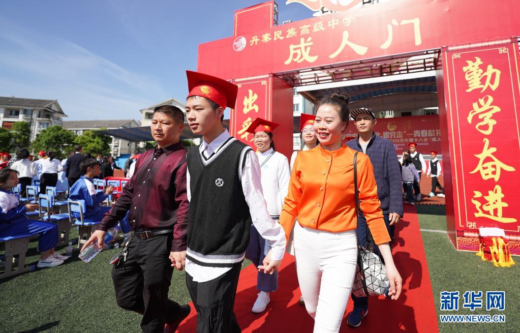 4月30日,在丹寨县民族高级中学,学生与家长走过“成人门”。