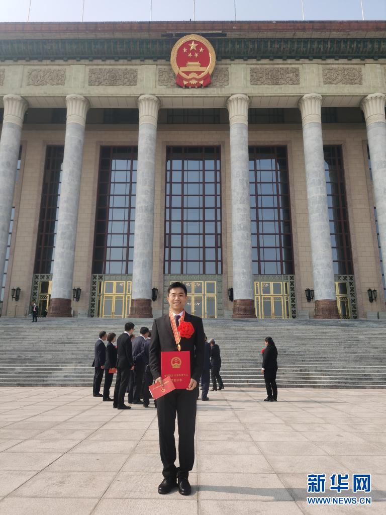 陈洪顺荣获全国脱贫攻坚先进个人称号后,在北京人民大会堂前留影(2月25日摄)。