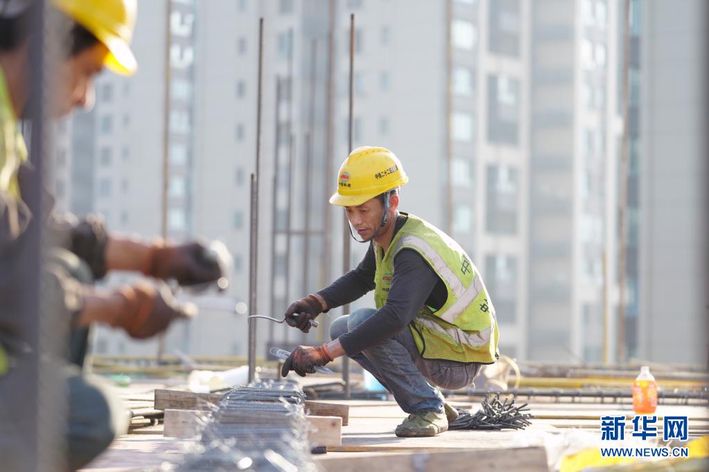 4月30日,工人在重庆市北碚区朝阳小学天生校区施工现场绑扎钢筋。