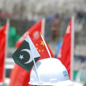 这是4月30日在巴基斯坦曼塞赫拉苏吉吉纳里水电站大坝二期截流仪式现场拍摄的中国和巴基斯坦国旗。