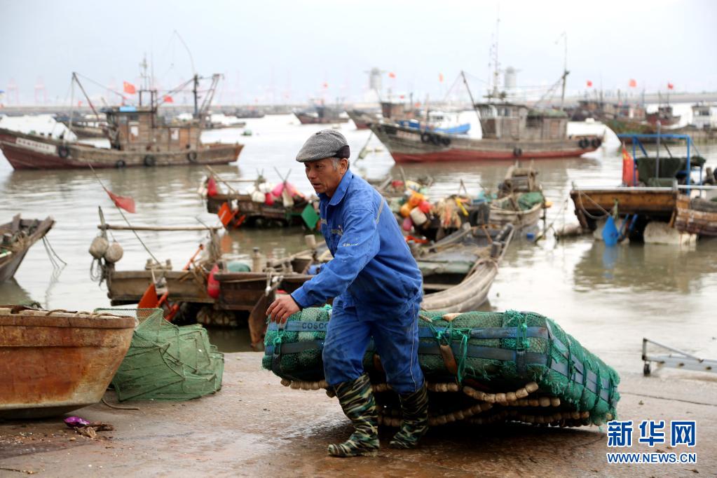 4月30日,渔民在江苏省连云港市连云区连岛渔港码头整理渔具准备休渔。