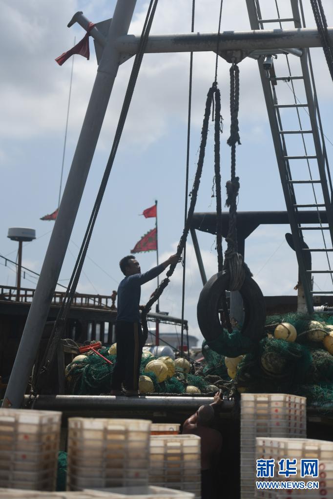 5月1日,渔民在海南三亚崖州中心渔港整理渔具。