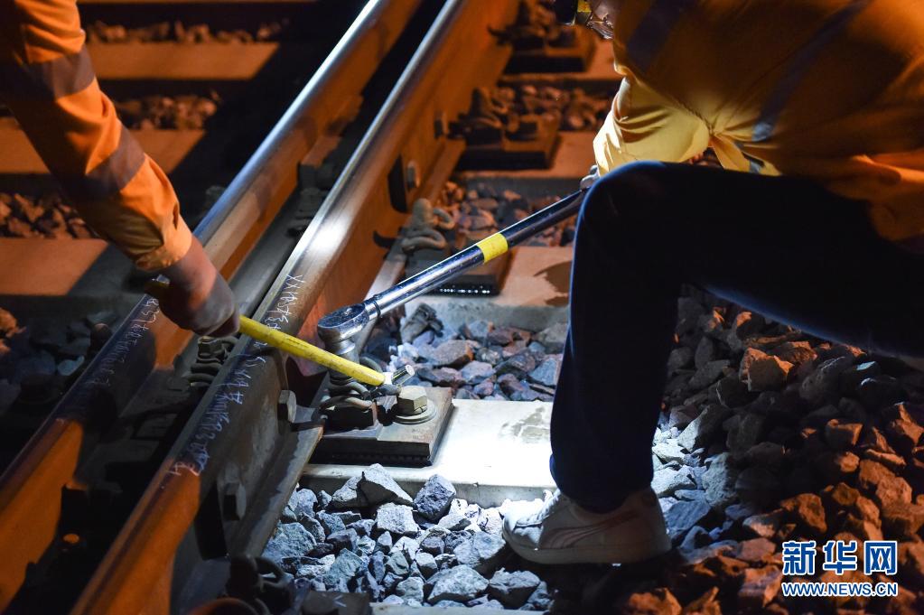 5月1日凌晨,线路工在安徽芜湖工务段宣城高铁线桥车间芜湖综合维修工区对高铁线路螺栓扭力距进行检查测试。