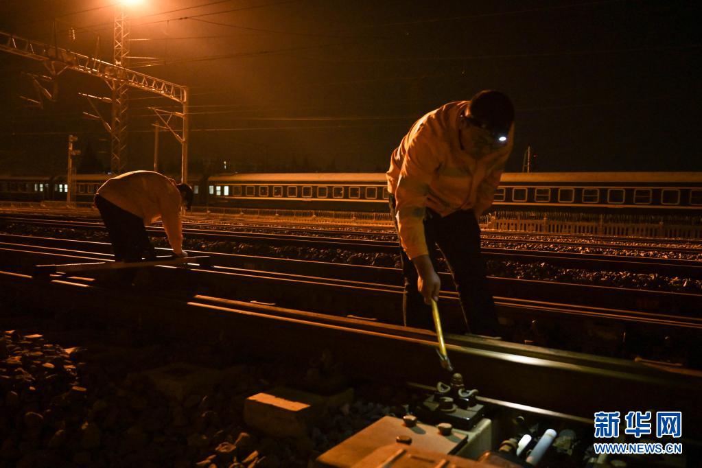 当日凌晨,中国铁路上海局集团有限公司芜湖工务段宣城高铁线桥车间芜湖综合维修工区的线路工利用夜间高铁停运的“天窗期”,对合杭高铁芜湖站内关键道岔、钢轨设备进行精细检测,消除线路设备隐患,保障假期列车安全平稳运行。