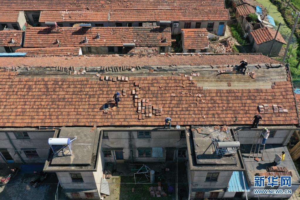 5月1日,在江苏省南通市通州区环本农场,村民在修补受灾房屋(无人机照片)。