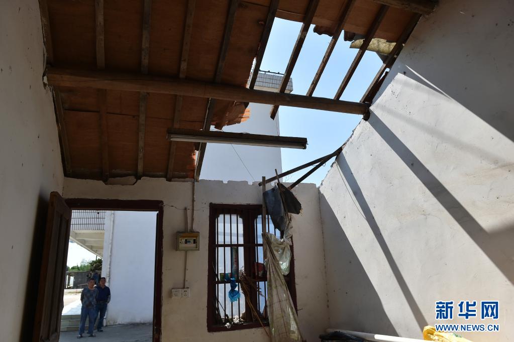 5月1日在江苏省南通市通州区环本农场拍摄的在大风中损毁严重的民房。
