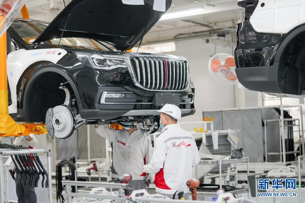 在位于吉林长春的一汽红旗工厂总装车间,工人在装配车辆(4月28日摄)。