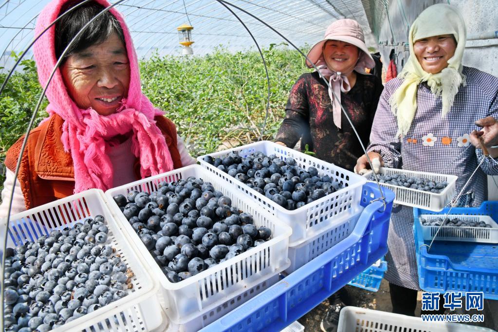 5月1日,青岛西海岸新区宝山镇肖家屯村的果农在大棚里展示采摘的蓝莓。