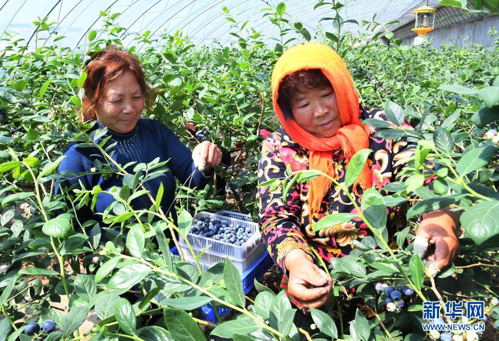 5月1日,青岛西海岸新区宝山镇肖家屯村的果农在大棚里采摘蓝莓。