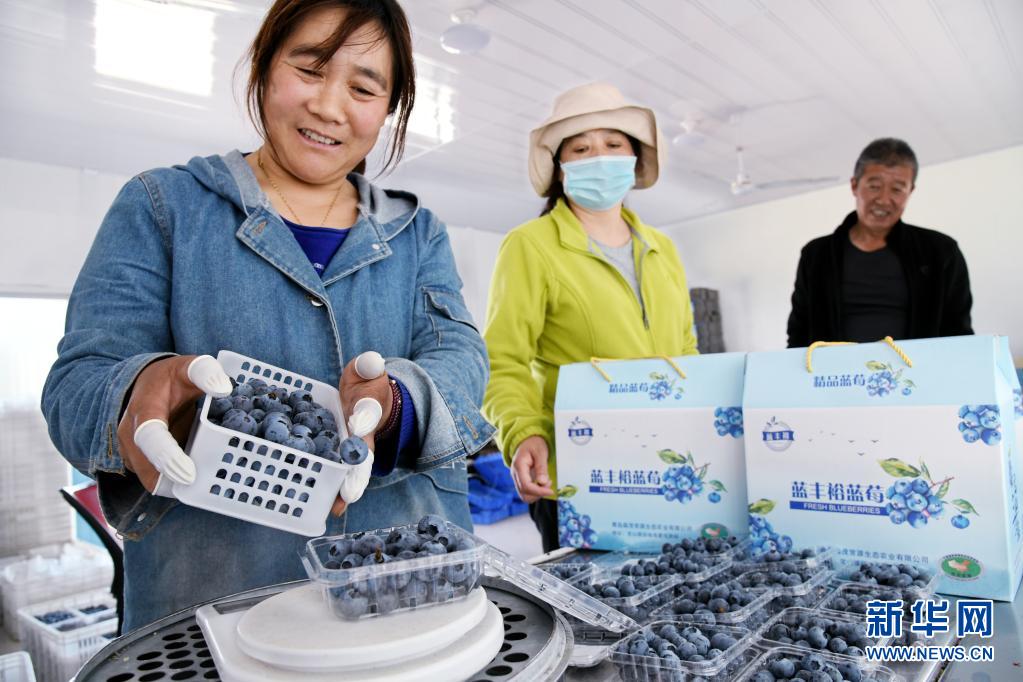 5月1日,青岛森茂常源生态农业有限公司的工人在包装即将运往北京的蓝莓。