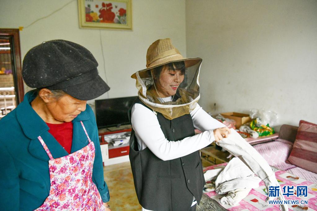 袁小梅(右)在检查蜂箱前穿戴防护手套(4月28日摄)。