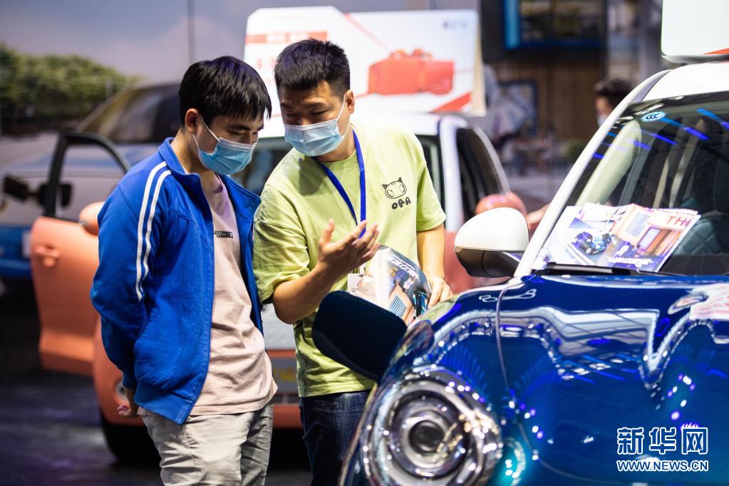 5月1日,工作人员(右)向观众介绍展车。