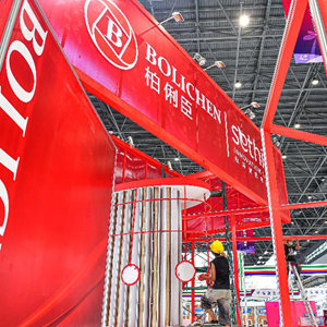 5月1日,工人在位于海口的海南国际会展中心消博会展台施工。