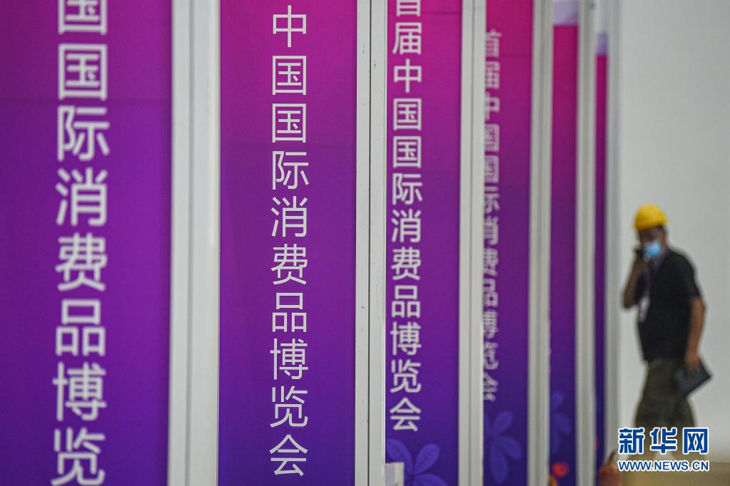 首届中国国际消费品博览会将于2021年5月7日至10日在位于海口的海南国际会展中心举办。目前,工人们正加紧搭建展台,展台搭建工作即将完毕。展台搭建完毕后,参展物品将陆续进入各展馆。