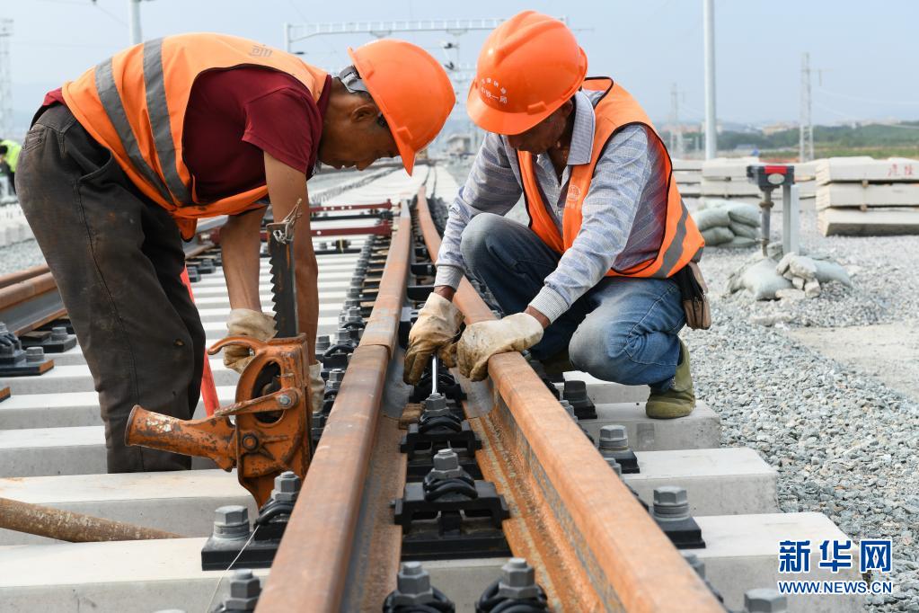 5月1日,工人在中老铁路国内段云南西双版纳火车站工地进行铺轨作业。