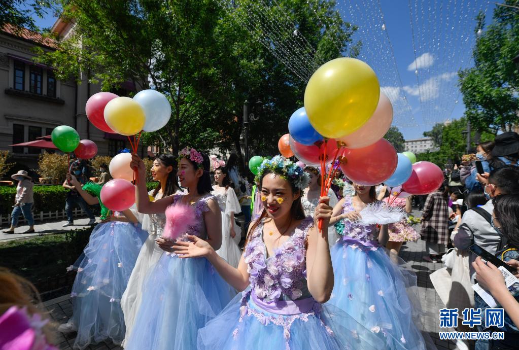 5月1日,在天津市河北区意式风情街,演员在街区巡游。