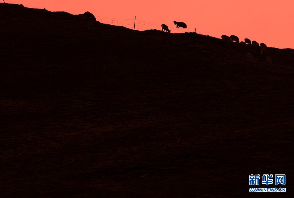 4月22日黄昏时分,在位于青海省海北藏族自治州的祁连山国家公园油葫芦保护分区,一头岩羊高高跃起跨越障碍。